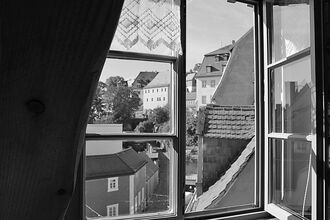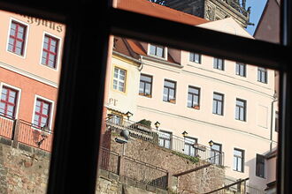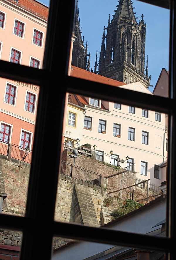 - Ausblick auf die Dächer der Meißner Altstadt, vom Küchentisch aus zu den Domtürmen auf dem Burgberg