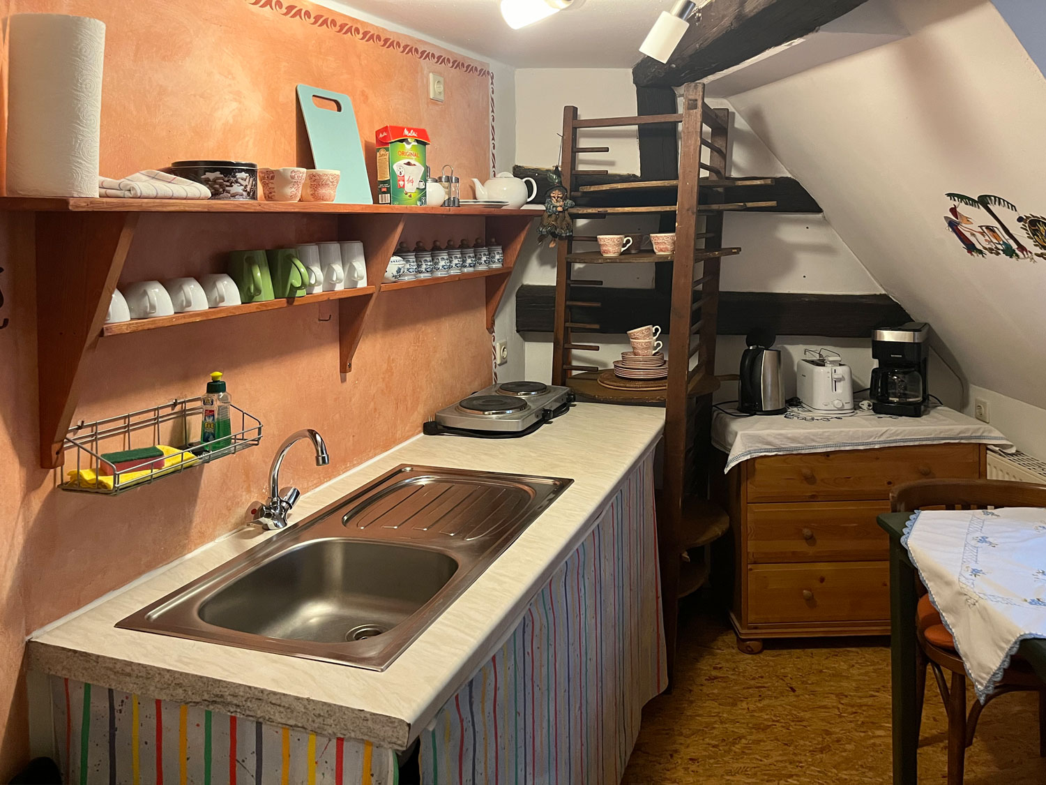 - kleine Küche mit Kühlschrank, Kaffeemaschine, Wasserkocher, Toaster, Geschirr, Esstisch